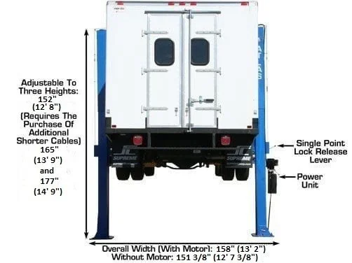 The Atlas® PV15PX is a commercial grade lift designed to accommodate everything from standard cars to heavy duty service trucks . The distance between the symmetrical columns is almost 123″ with a drive through space of over 108″. The extra distance between the symmetrical columns will allow the widest of vehicles or vehicles with wide rearview mirrors to be lifted or driven through. The increased length of the symmetrical arms coupled with the additional height of the included peg style truck adapter set allows the operator to safely raise long wheel base trucks with a variety of running boards. The extra height means extra clearance allowing you to lift vans and box trucks without worry.